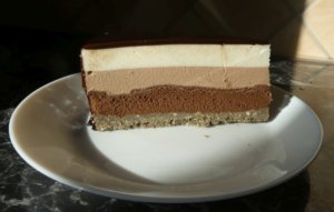 A 4 g zselatint egy evőkanál és egy teáskanálnyi vízzel keverjük el egy kis edényben, és hagyjuk duzzadni. A 150 g tejcsokoládét gőz felett olvasszuk meg a 120 g habtejszínnel. Ha egynemű, akkor melegítsük meg a zselatint, ahogy elolvadt, öntsük a csokoládéba és jól keverjük el. Hagyjuk hűlni nagyjából szobahőmérsékletűre vagy kézmelegre. A 160 g hűtött habtejszínt verjük fel borotvahab állagúra. Öntsük bele a csokoládé krémet és keverjük el. Öntsük az étcsokoládés moussera, ami mostanra kissé már dermedt.