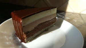 Bár 24 fokos volt a glazúr, várnom kellett volna még 2-3 percet, hogy hűljön, hogy 23-24 fok határán legyen. A torta se fagyott ki valószínűleg kellően, így nem dermedt meg elég gyorsan a torta oldalán a glazúr. Látszik az oldalsó peremen hogy áttetsző a fehércsokis mousse réteg. Ennek kendőzésére gyorsan habzsákba töltöttem a maradék glazúrt, kicsi kerek csövet raktam rá és szándékos megfolyásokat produkáltam a torta szélére. Nincs díszítve a teteje, mert ez csak kóstoláshoz készült. Ami nekem nagyon hiányzott, az egy kis textúra változatosság. A következő tortának cukrász panírt fogok tenni a szélére, hogy legyen egy kis roppanós íz is. Reméljük nem vizesedik el rajta. Egy hét múlva jövök az eredménnyel.