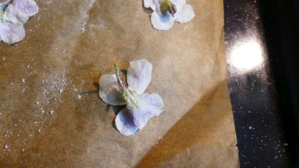 A virágot a két ujjunk közé fogjuk és az összes szirmát lekenjük ecset segítségével tojásfehérjével alul felül. Kicsi jusson a zöld részére is, hogy rögzítsük ezáltal a szirmokat. Az első 10-15 virágnál még élvezi az ember, utána már mikor mindene ragad és löttyednek a szirmok, kezd becsületbeli hadiműveletté válni a folyamat.