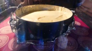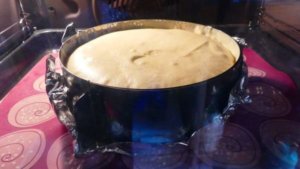 Készítsük elő a sütőformát. Az esetemben egy tepsire rakott 21 cm-re állított 7,5 cm magas tortagyűrű, alja alufólia, amit a szélekre felhajtottam, ne folyjon ki a tészta. Kikészítem a formaelválasztó sprét (Lidls márka az enyém, elég sok tortára elég egy spré, megéri beruházni rá), ennek hiányában olajjal kikenés és lisztezés következik.