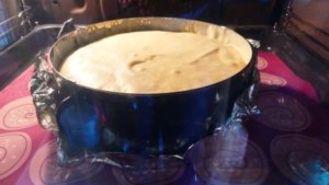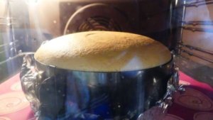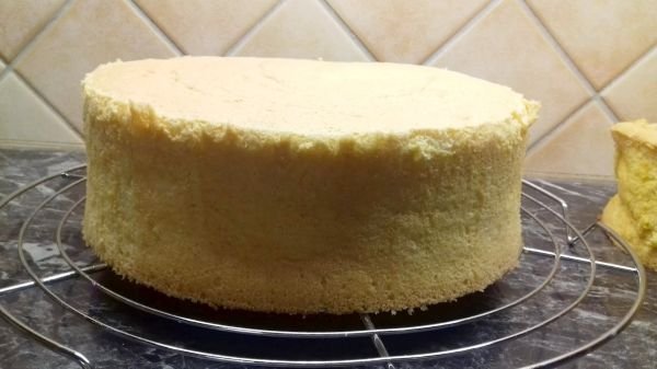 Ha formaelválasztót használok, akkor most fogom lefújni a formát, majd óvatosan beleöntöm a tésztát. Vékony hártyát a tésztából a tortagyűrű pereméig felhúzok. Ennek az a célja, hogy az a hártya gyorsan odasül és kapaszkodó felületet biztosít a növekvő piskóta számára, így egyenes masszív szél fog sülni a tészta magasságáig. Ha ezt nem tesszük meg, akkor könnyen lehet, hogy csak addig lesz egyenes szép széle a tésztának, ameddig a beleöntéskori tésztamagasság volt. Egyszer-kétszer odacsapjuk kicsit a pulthoz a tésztát, és mehet a 160 fokos sütőbe. 30 percre állítom az időzítőt. Kinyitni nem szabad eddig, mert ha még nem kötött meg a szerkezet, akkor összeeshet. 30. percnél megnézem hogy áll, 150 fokra leveszem a hőfokot. Szinte biztosan legalább 15 perc kell még neki. Ilyenkor azt szemrevételezem, hogy nem repedt-e meg, egyenletes-e a felszíne, szépen feltapadt-e a formára. 40.-50. perc táján tűpróbát tartok egy saslik pálcikával, ekkor látom, hogy mennyire nem sült még meg. Ez dönti el a maradék sütési időt. Ekkora formánál nagyjából 50-70 perc közötti idővel kell számolni. A piskóta mondja meg mikor jó!