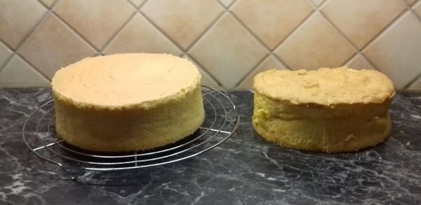 Mindkét tészta ugyanazon alapanyagból, ugyanez a recept alapján 2 óra eltéréssel készült. Az első tipikus esete a rosszul elkeverésnek, ahogy hűlt, úgy esett össze rémálommá. A másodiknál odafigyeltem mindenre jobban, és iskolapélda lett a szép piskótára.