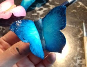 Teljesen szárítsuk meg a pillangót a jégzselé előtt. Jégzselének kell legalább egy nap száradás, de utána fényesebb lesz a pillangó, kevésbé gyorsan ázik el, viszont kissé utána is ragad a zselétől, ezért elszeparáltan kell őket tárolni. Nekem erre jól bevált a mascarpone doboza, abból úgy is sok van a tortakészítés miatt.