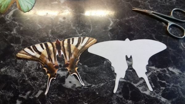 Ha nincs sablonotok, akkor kézzel is rajzolhattok rá. Körbevágom úgy, hogy a ceruzavonal ne legyen rajta a kivágott pillangón, tehát a belső vonal határán vágom.