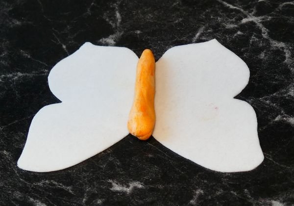 A testet fondantból, marcipánmasszából, modellmasszából stb-ből lehet elkészíteni. Kis festékkel megszínezem, és pillangó testet formázok belőle. Bordázatot rajzolok a hátába, és ráhelyezem az ostyára ahol a test helye van. A szarvakat ostyacsíkból vágom ki és tűzőm a fejbe, majd lefestem.