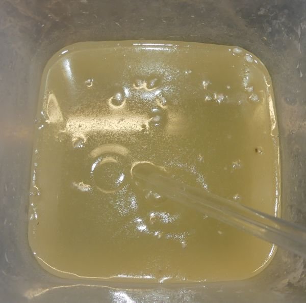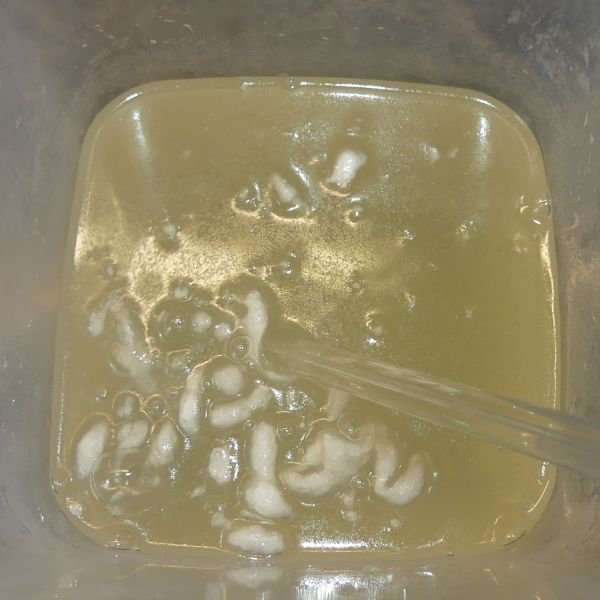 A vizes, cukros, forró lúgban oldjuk fel a selymet. Fontos, hogy teljesen felolvadjon. Lenti képsorokon az olvadás folyamatát láthatjátok: